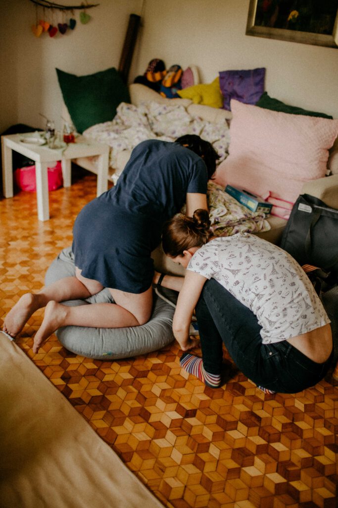 W domu poza tym panowała cisza, nikogo poza nami nie było. Starsza córka poszła jak zwykle rano do szkoły. Dowiedziałam się, że niestety skończyła się już romantyczna i przyjemna nocna atmosfera, kiedy skurcze były łagodne, paliły się świece i leciała muzyka. A teraz to już ciężkie klimaty i ból. Basia czuła intuicyjnie, że zaczęły się skurcze parte i chciała, aby dołączyła już do nich położna. Okazało się jednak, że musiała pojechać do innego porodu i w jej zastępstwie przyjedzie położna Karolina.