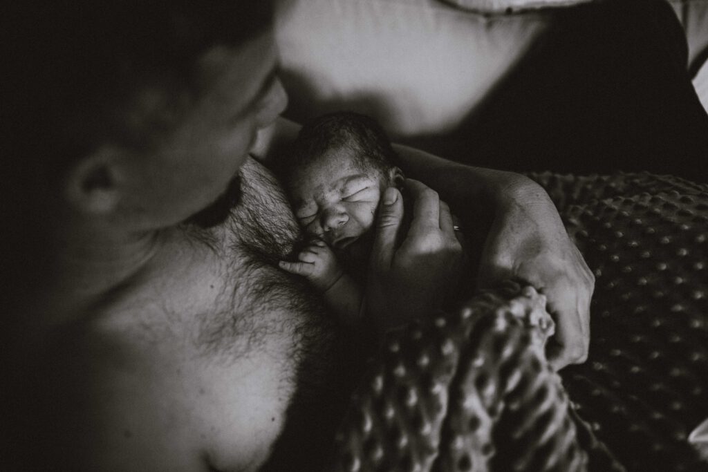Powoli zaczęła się wyłaniać główka, więc szybko zawołałam Michała, który przygotowywał herbatę, żeby nic go nie ominęło. Pięć minut później na świecie był już Daniel. Z tego etapu nie mogę pokazać wszystkich zdjęć, jednak chyba to jedno i tak oddaje emocje tego dnia. Basia żartowała później, że urodził się w starej łazience, w której kafelki kładł dawno temu jego dziadek.